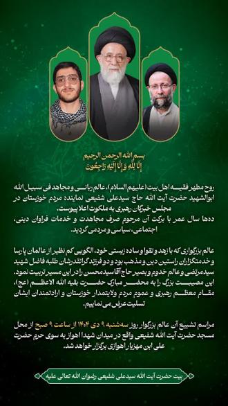 روح مطهر فقیه اهل بیت، عالم ربانی و مجاهد فی سبیل الله ابوالشهید حضرت آیت الله حاج سیدعلی شفیعی نماینده مردم خوزستان در مجلس خبرگان رهبری به ملکوت اعلا پیوست.