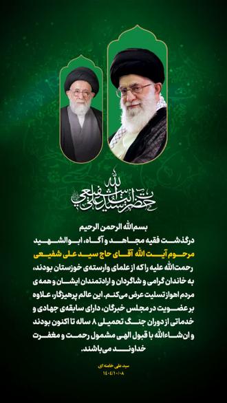درگذشت فقیه مجاهد و آگاه، ابوالشهید مرحوم آیتالله آقای حاج سید علی شفیعی رحمتالله علیه را که از علمای وارستهی خوزستان بودند، به خاندان گرامی و شاگردان و ارادتمندان ایشان و همهی مردم اهواز تسلیت عرض میکنم.